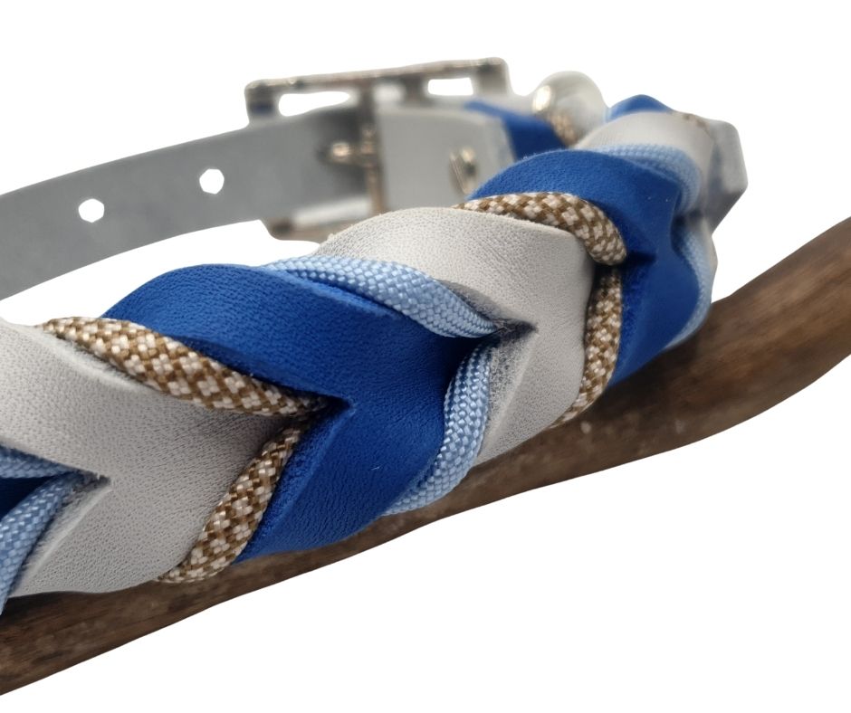 Dieses hochwertige Hundehalsband vereint langlebige Materialien mit liebevollem Handwerk. Gefertigt aus echtem Fettleder und geflochtenem Paracord in Blau, Grau und Naturtönen, steht es für Zuverlässigkeit und stilvolle Zurückhaltung zugleich.